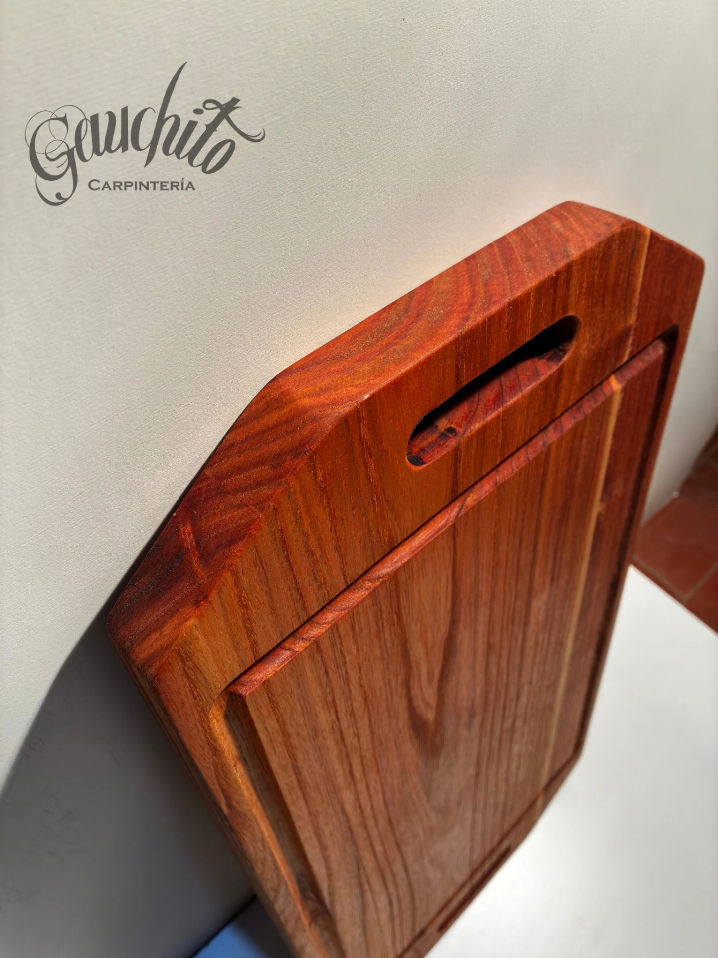 Hecha a mano con madera maciza, canaleta para jugos y doble manija.
